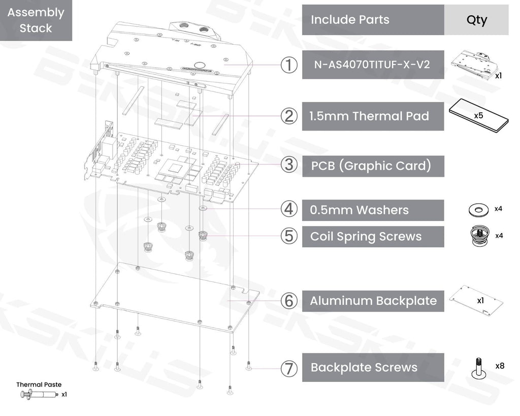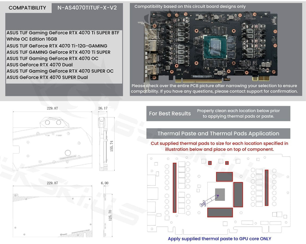 The manufacturer reserves the right to alter the block design to expand compatibility. The delivered item may not 100% match the pictured item. The product does NOT come with English instructions. Please see the product gallery images for the install guide if available. Generally, thermal pads should be installed on the card where the block has corresponding raised contact points, except the GPU core, which uses thermal paste. Installing pads on other components can lead to improper contact and poor performance.