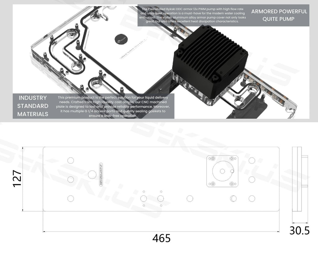 The Bykski Distro or Distribution Plates provide a distinct and innovative way to enhance your loop's appearance. These plates are customized to fit your specific case, creating a sleek and parallel look. Moreover, they can come equipped with an OPTIONAL inline pump, allowing you to power your entire loop from the centerpiece.