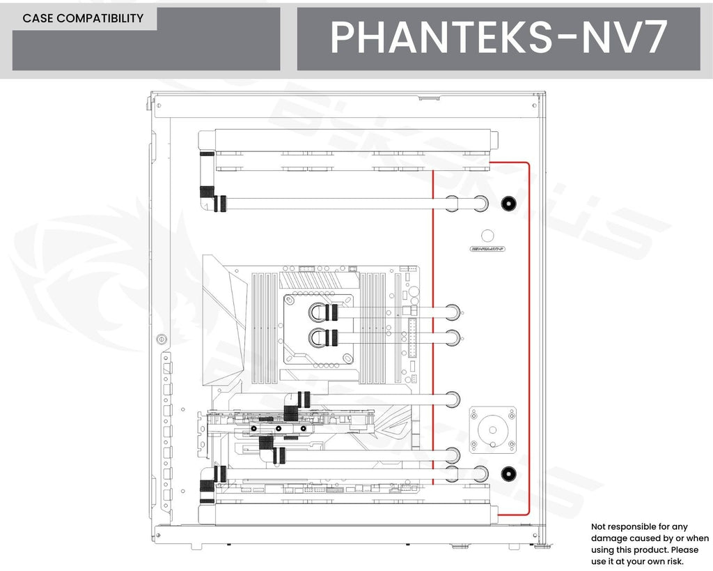 The Distro Plate is built using PMMA material, featuring G 1/4 threads, and is designed to be compatible with the PHANTEKS-NV7 case. It works well with Aluminum and Non-Aluminum loops and is engineered to support radiators up to 30mm thick or less.